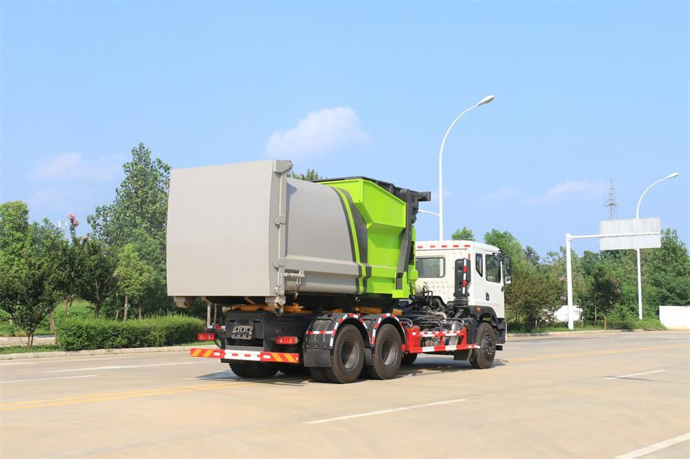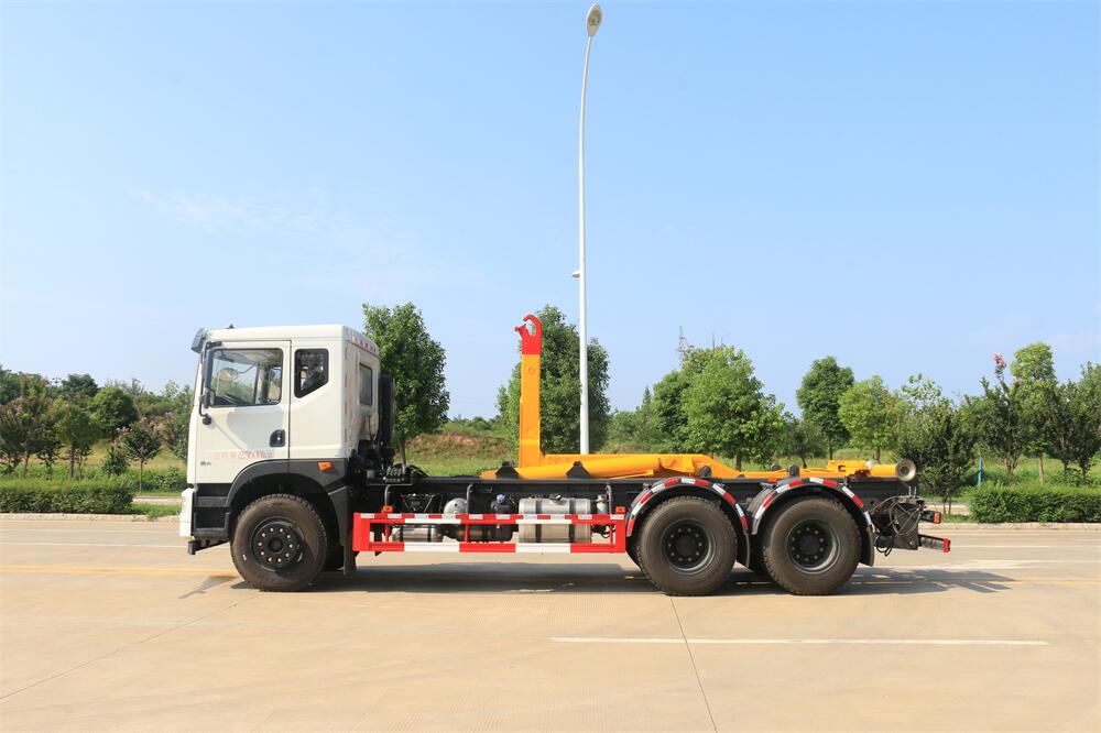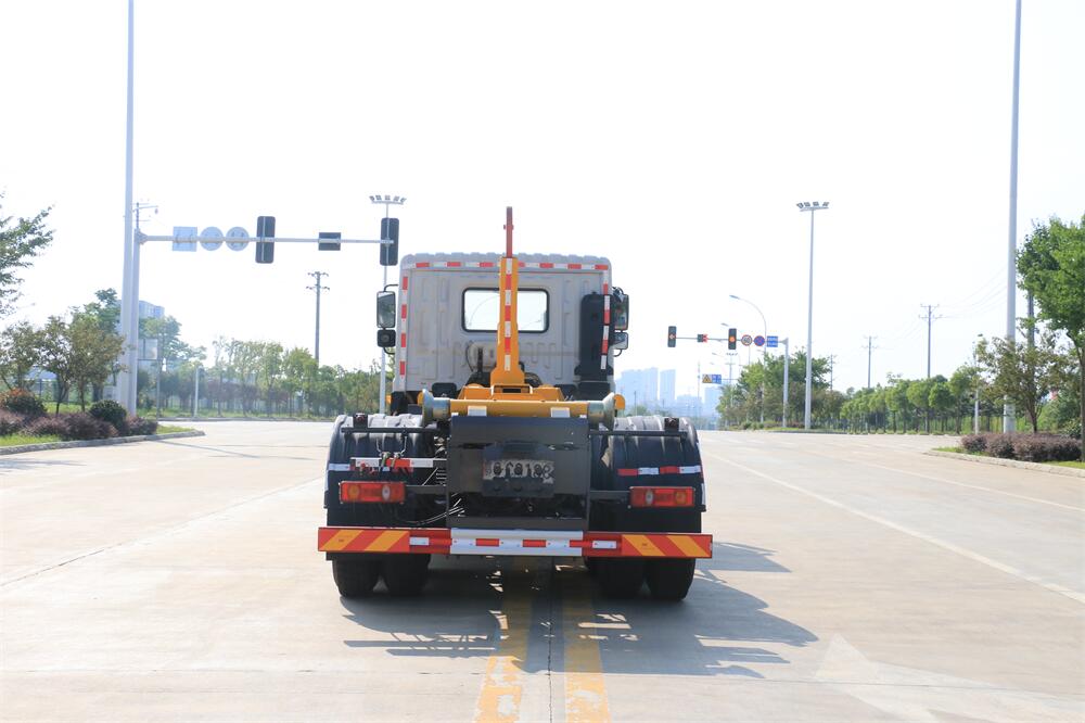勾臂式垃圾車(車廂可卸式垃圾車)介紹: 車廂可卸式垃圾車又叫拉臂式垃圾車,是一種采用高新設(shè)計可伸縮的鉤臂,實現(xiàn)垃圾廂的二次吊裝,自吊上放下,可自行傾倒垃圾的環(huán)衛(wèi)設(shè)備。 拉臂式垃圾車結(jié)構(gòu)簡單,操作穩(wěn)定方便,裝卸效率高,機械化程度高,節(jié)省人力。鉤臂垃圾車一車可帶多個垃圾廂,在裝卸的運輸過程中可有效地避免二次污染。 拉臂垃圾車采用高新設(shè)計可擺動的鉤臂,垃圾箱由框架、開啟油缸、滑輪、后門和若干加強框架與鋼板焊接而成。調(diào)換貨廂快捷方便,貨廂上帶蓋(倒垃圾時可翻開),鉤臂垃圾車?yán)鴰w可選用碳鋼、不銹鋼材質(zhì)、內(nèi)部采取環(huán)氧樹脂防腐處理,改裝部分與原車底盤為可分離式,維修方便且保持了原車的機動性及行駛性能。